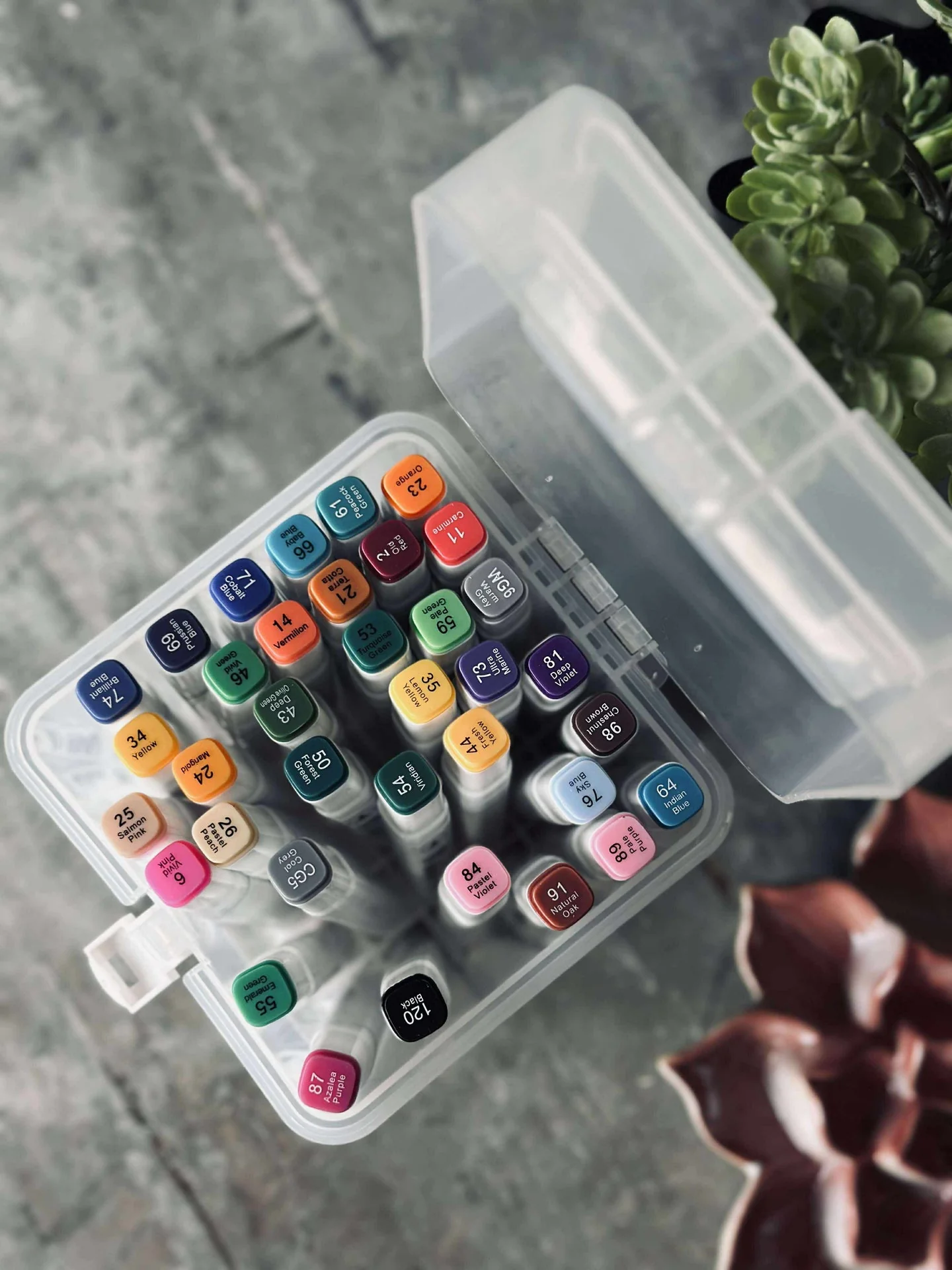 Tuschpennor i ett brett fÀrgsortiment. Den ena Ànden har en bred, snedstÀlld spets avsedd för fÀrglÀggning av större ytor och breda drag. Den andra Ànden har en fin spets, avsedd för lÀtta penseldrag. Praktisk förvaringsask med handtag, vilket underlÀttar bÄde förvaring och transport.